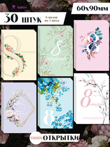 Набор мини открыток для подарков на 8 марта "Нежность" / 30 шт / набор 6 видов по 5 шт