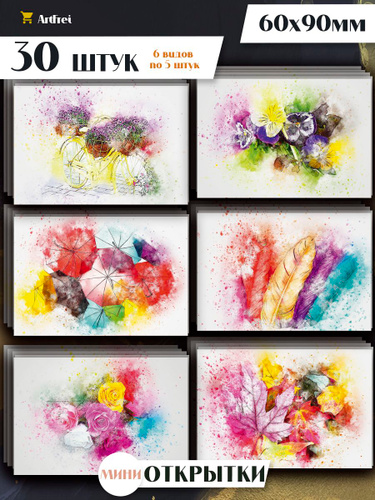 Мини открытки "Акварель" / 30 штук / набор 6 видов по 5 шт