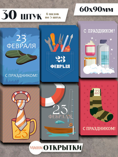 Открытки 23 февраля прикольные "Подарочки" / 30 штук / набор 6 видов по 5 шт