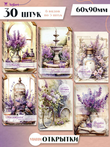 Мини открытки "Лаванда Ретро" / 30 штук / набор 6 видов по 5 шт