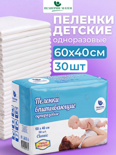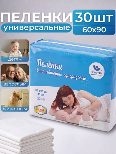 Пеленки одноразовые детские Пелигрин впитывающие 60х90 см, 30 шт.