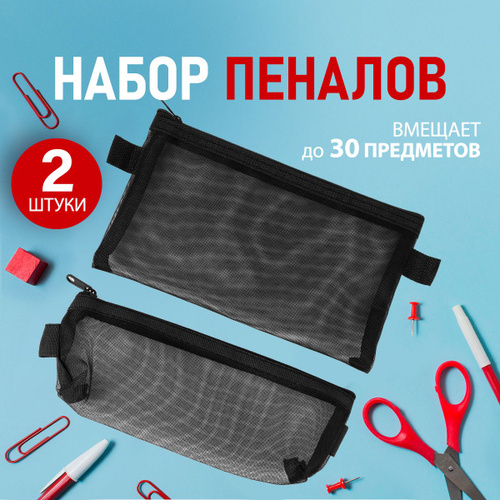 Пенал школьный для девочки и мальчика черный в сетку. Косметичка женская прозрачная сетка, набор 2 шт.