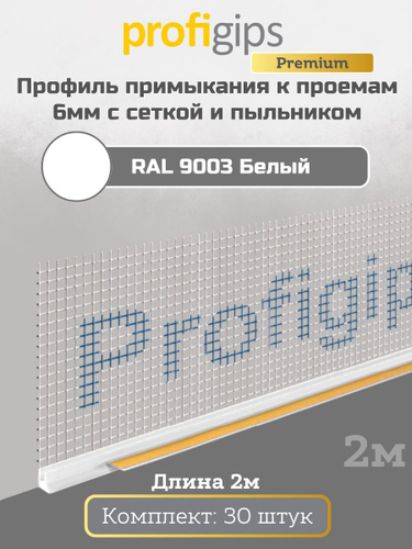 Нащельник для окон профиль примыкания Profigips Premium (Профигипс) 6мм * 2000мм (30 штук) с сеткой и манжетой, цвет: белый