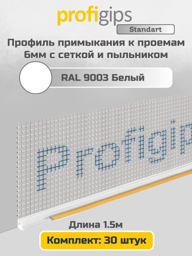 Нащельник для окон профиль примыкания 6мм * 1500мм (30 штук) с сеткой и манжетой, цвет: белый, Profigips (Профигипс)