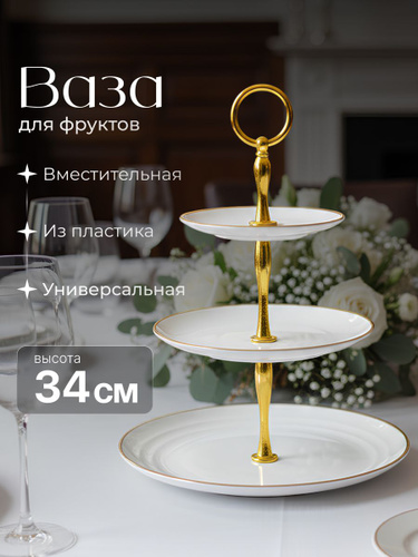 Фруктовница трехъярусная этажерка пластиковая Shiny Kitchen, бело-золотистая