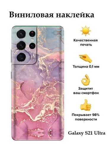 Гидрогелевая пленка на заднюю крышку телефона Galaxy S21 Ultra с защитой камеры / Защитная пленка для Галакси С21 Ультра с принтом Marble Magenta