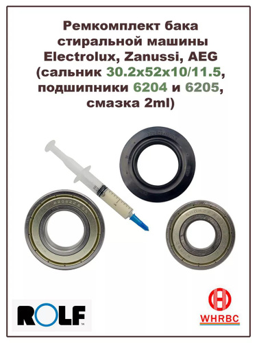 Ремкомплект бака стиральной машины Electrolux, AEG, Zanussi (сальник 30x52x8/9, подшипники 6204 и 6205, смазка)