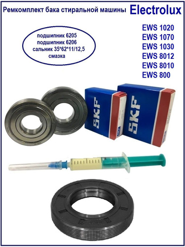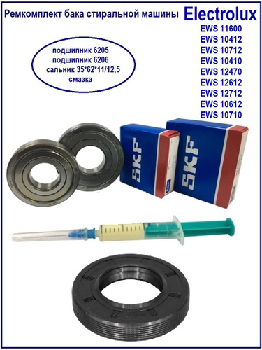 Ремкомплект бака стиральной машины Aeg, Electrolux, Zanussi, Candy (сальник 35x62x11/12.5 двойной, подшипники 6 205 и 6 206, смазка)