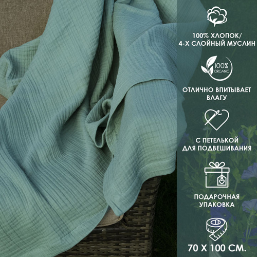 Tex-story Полотенце банное Муслиновое полотенце 70х100, Муслин, 70x100 см, зеленый, 1 шт.