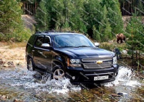 "Черный Chevrolet Tahoe, движущийся по лесной речке". 21х30 см. Постер А4_012.