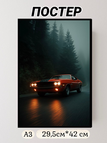 Постер интерьерный А3, автомобиль красный Dodge Challenger, ретро плакат
