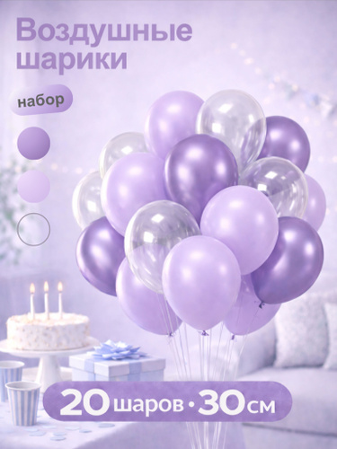 Воздушные шары для праздника/дня рождения/фотозоны. Сиреневый/сиреневый хром/прозрачный 20 шт. 30 см.