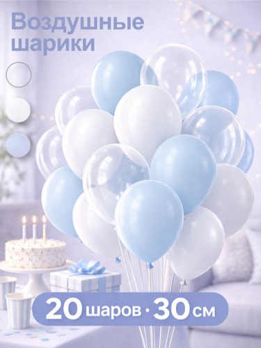 Воздушные шары для праздника/дня рождения и фотозоны/выписки. Белый/Нежно-Голубой/Прозрачный 20 шт. 30 см.