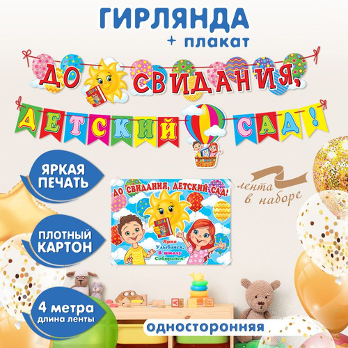 Гирлянда-растяжка бумажная на стену для украшения интерьера и фотозоны в школе "До свидания, детский сад!" + Плакат для фотосессии (Длина ленты 4 м)