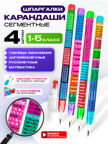 Карандаши простые для школы, набор 4 шт. (Начальная школа: английский, русский, математика, таблица умножения) прикольные, со сменными грифелями