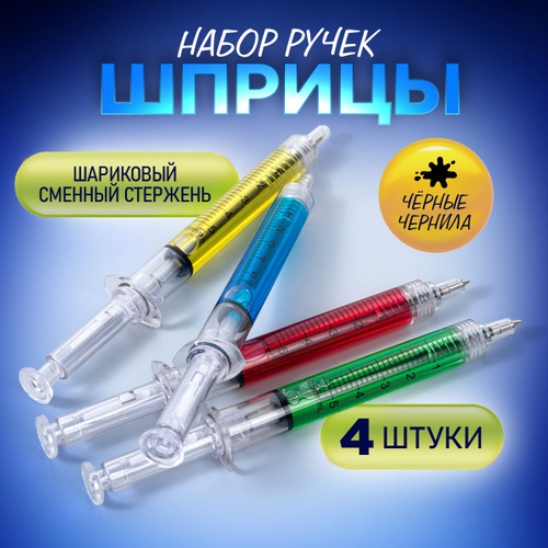 Подарочный набор ручки-шприц с жидкостью шариковые 4 штуки, чернила черные. Сувенир, ручка шариковая-прикол шприц.