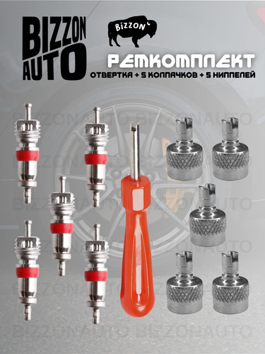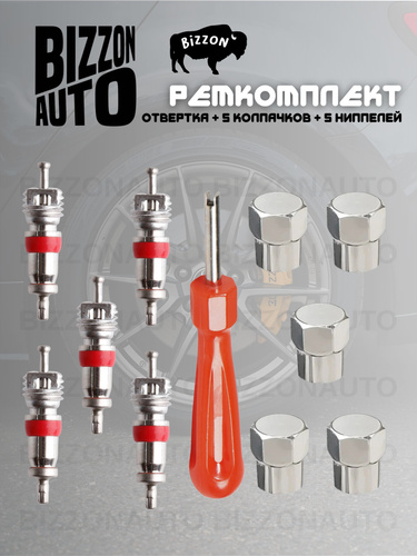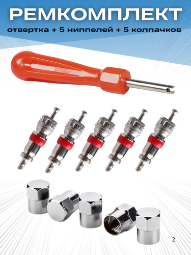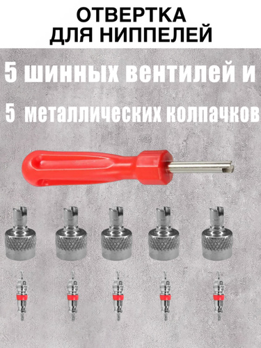 Колпачки на ниппель авто ХРОМ 5 шт., золотники 5 шт., отвертка/экстрактор золотника 1 шт.