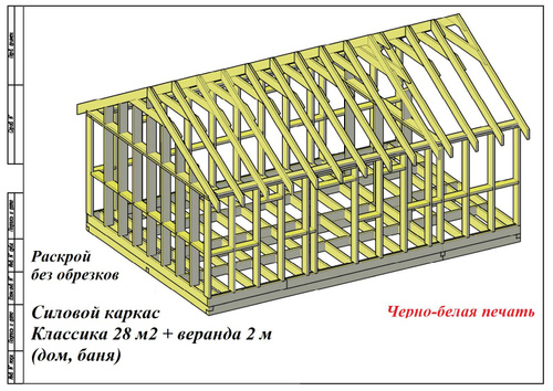 Раскрой без обрезков. Силовой каркас Классика 28 м2 + веранда 2 м (8х5,4 метра). Проект дома, бани.