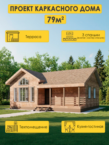 Проект одноэтажного каркасного дома 79м2 с 3 спальнями, кухней-гостиной и 2 санузлами