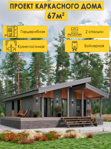 Проект одноэтажного каркасного дома 67м2 с 2 спальнями и террасой