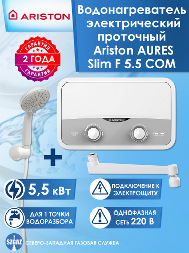 Проточный водонагреватель электрический Ariston AURES SF 5.5 COM (5,5 кВт) с лейкой для душа, настенный электроводонагреватель Аристон для ванны