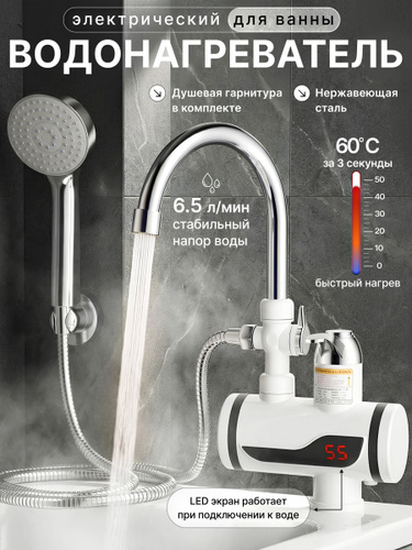 Водонагреватель проточный электрический кран с душем 6л/мин, нагреватель для горячей воды