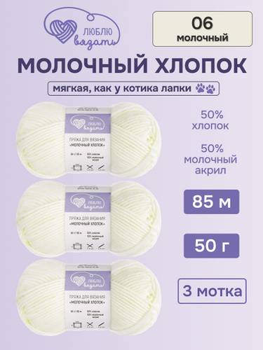 Пряжа для вязания Молочный хлопок (Milk Cotton), 50 г, 85 м, 3 шт, Люблю Вязать, 06 молочный