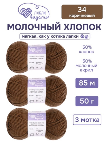 Пряжа для вязания Молочный хлопок (Milk Cotton), 50 г, 85 м, 3 шт, Люблю Вязать, 34 коричневый