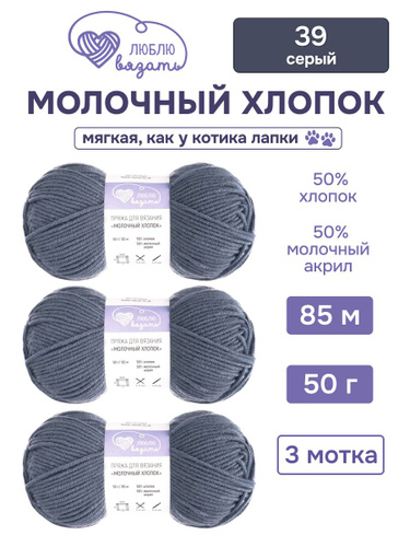Пряжа для вязания Молочный хлопок (Milk Cotton), 50 г, 85 м, 3 шт, Люблю Вязать, 39 серый