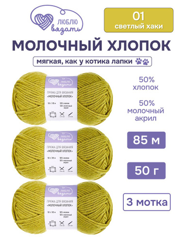 Пряжа для вязания Молочный хлопок (Milk Cotton), 50 г, 85 м, 3 шт, Люблю Вязать, 01 светлый хаки