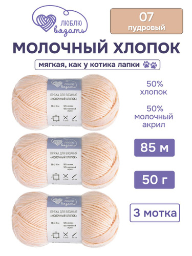 Пряжа для вязания Молочный хлопок (Milk Cotton), 50 г, 85 м, 3 шт, Люблю Вязать, 07 пудровый