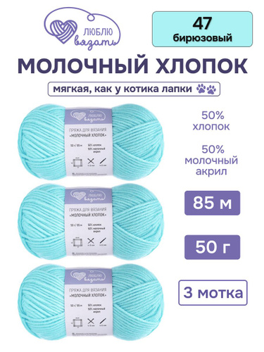 Пряжа для вязания Молочный хлопок (Milk Cotton), 50 г, 85 м, 3 шт, Люблю Вязать, 47 бирюзовый