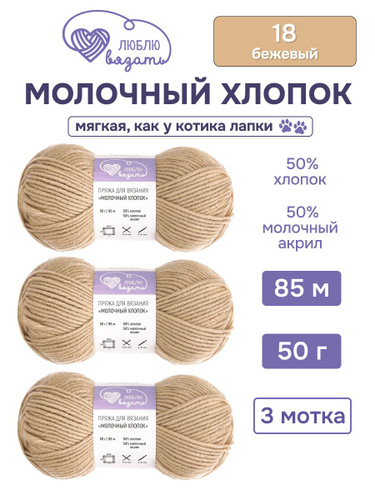 Пряжа для вязания Молочный хлопок (Milk Cotton), 50 г, 85 м, 3 шт, Люблю Вязать, 18 бежевый
