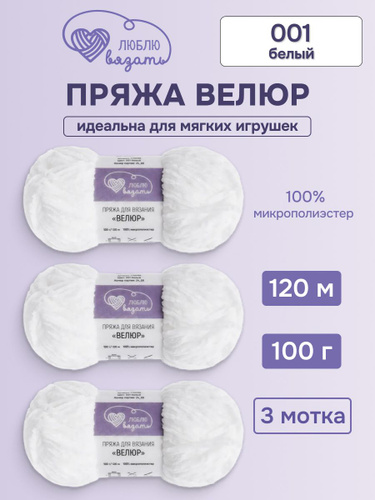 Пряжа для вязания Велюр, 100 г, 120 м, 3 шт, Люблю вязать, 001 белый