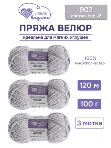 Пряжа для вязания Велюр, 100 г, 120 м, 3 шт, Люблю вязать, 902 светло-серый