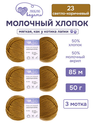 Пряжа для вязания Молочный хлопок (Milk Cotton), 50 г, 85 м, 3 шт, Люблю Вязать, 23 светло-коричневый