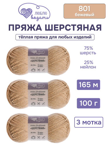 Пряжа для вязания Шерстяная, 100 г, 165 м, 3 шт, Люблю вязать, 801 бежевый