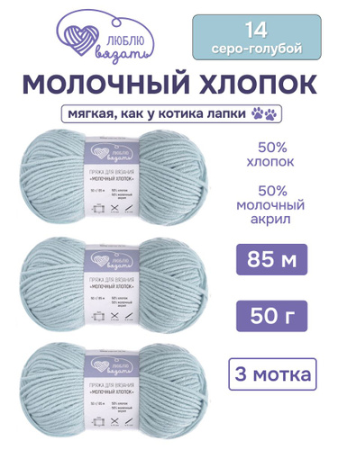 Пряжа для вязания Молочный хлопок (Milk Cotton), 50 г, 85 м, 3 шт, Люблю Вязать, 14 серо-голубой