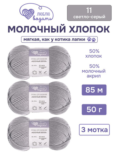 Пряжа для вязания Молочный хлопок (Milk Cotton), 50 г, 85 м, 3 шт, Люблю Вязать, 11 светло-серый