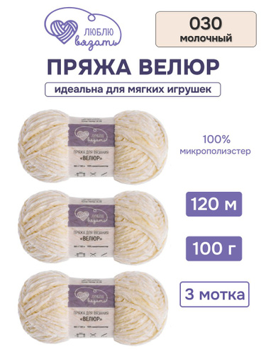 Пряжа для вязания Велюр, 100 г, 120 м, 3 шт, Люблю вязать, 030 молочный