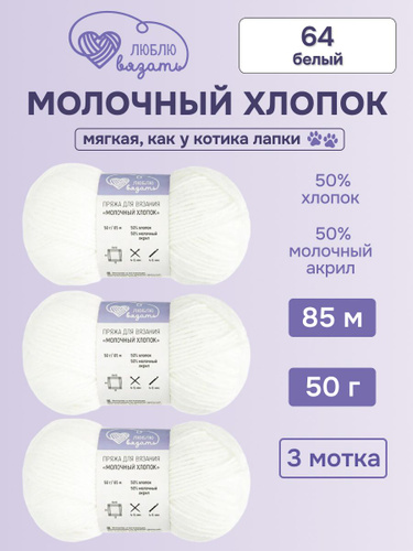 Пряжа для вязания Молочный хлопок (Milk Cotton), 50 г, 85 м, 3 шт, Люблю Вязать, 64 белый