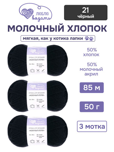 Пряжа для вязания Молочный хлопок (Milk Cotton), 50 г, 85 м, 3 шт, Люблю Вязать, 21 черный