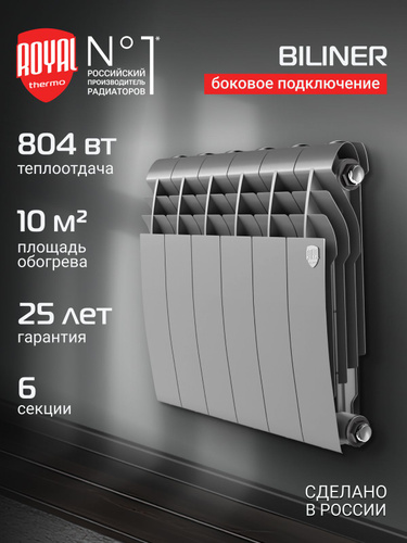 Радиатор отопления биметаллический Royal Thermo BILINER B 350 Серебристый - 6 секц., боковое подключение