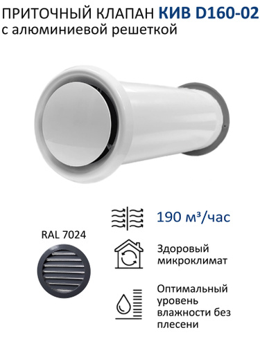 Приточный клапан КИВ160 с алюминиевой решеткой RAL7024, серый графит