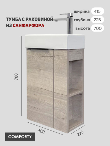 Тумба с раковиной узкая Comforty Матэ 40 см, подвесная, дуб дымчатый, правые полочки