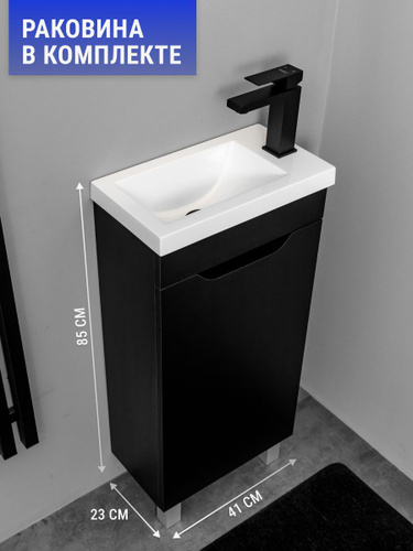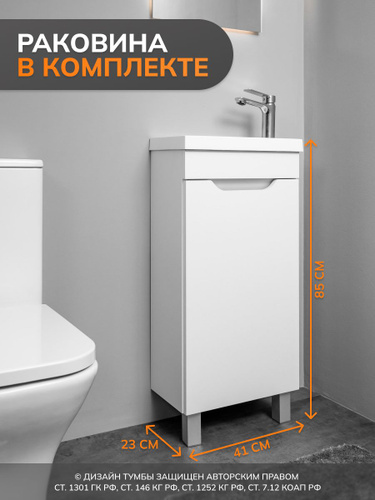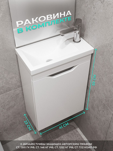 Тумба с раковиной DIWO Анапа 40 напольная, 41 см, белая, матовая, с дверками, раковина для ванной, фаянсовая, прямоугольная, с сифоном