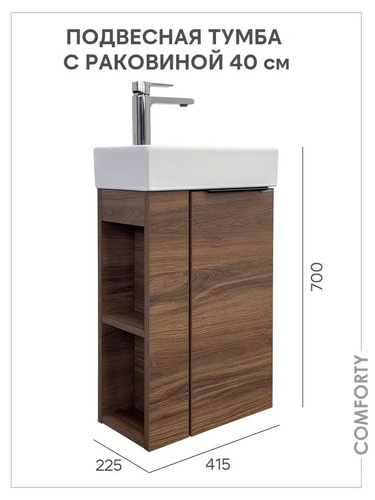 Тумба с раковиной 40 см подвесная Comforty Матэ-40 в туалет или ванную, узкая, дуб темно-коричневый