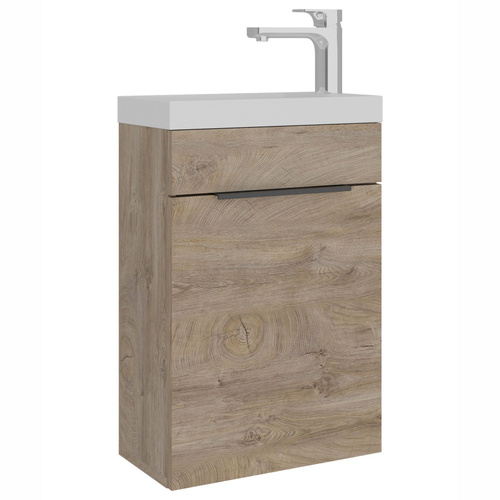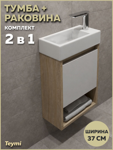 Тумба подвесная с раковиной для ванной 37 см Teymi Nura корпус дуб фасад белый раковина Hanna 37 правая F17454