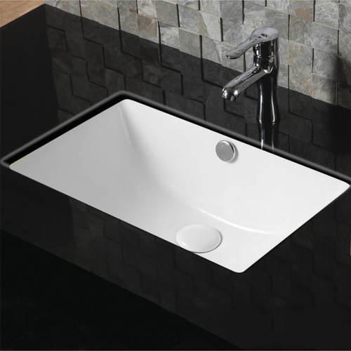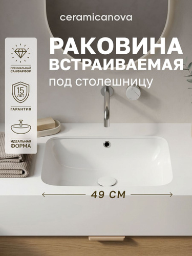 Раковина встраиваемая снизу Ceramicanova Era CN15004 53 без отверстия под смеситель, фарфоровая, раковина для ванной, белая, глянцевая, прямоугольная, со встроенным сливом-переливом