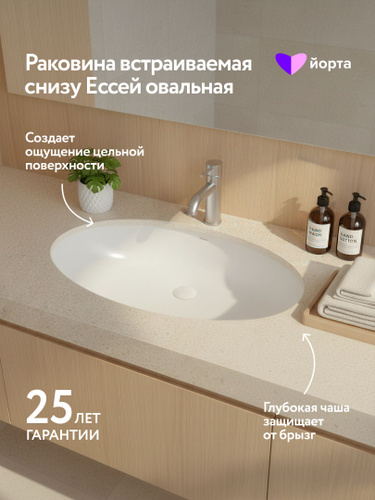 Раковина врезная встраиваемая снизу для ванной белая, 56х42,5х20 см, Йорта Ессей овальная
